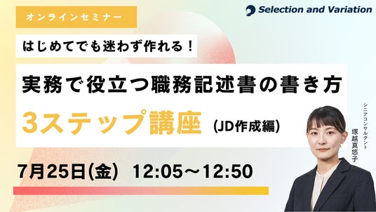 https://sele-vari.co.jp/ )は『はじめてでも迷わず作れる!実務で役立つ職務記述書の書き方3ステップ講座(JD作成編)』セミナーを2025年7月25日(金)12:05~12:50に開催することをお知らせいたします。