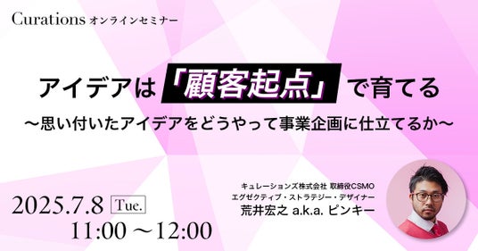 顧客企業のビジネス変革を成功に導くキュレーションズ株式会社(本社:東京都渋谷区、担当:野崎、以下当社)は、「アイデアは「顧客起点」で育てる ~思い付いたアイデアをどうやって事業企画に仕立てるか~」を2025年7月8日(火)に開催いたします。