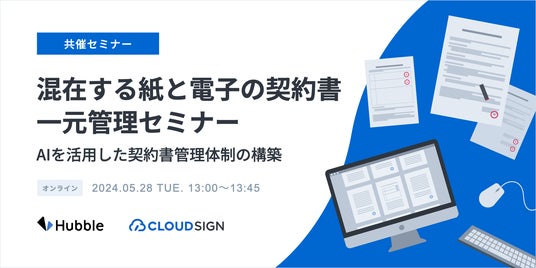 契約書を入れるだけでAIが網羅的な契約データベースを構築する契約書管理クラウドサービス「Hubble mini(ハブル ミニ)」を提供する株式会社Hubble(東京都渋谷区、CEO:早川晋平)は、2024年5月28日 (火) 13:00-13:45にて、クラウドサイン(弁護士ドットコム株式会社)と共同で「紙と電子の契約書一元管理セミナー -AIを活用した契約書管理体制の構築-」を開催いたします。本セミナーでは、弁護士ドットコム株式会社 マーケティング部 降井 有希氏、当社BizDev/Business Analytics & Operations 渡邊が登壇いたします。本セミナーは事前登録制・オンライン配信です。