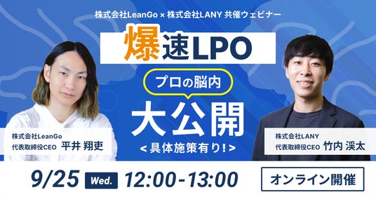 株式会社LeanGo(本社:東京都目黒区、代表取締役:平井 翔吏、以下 弊社)は、株式会社LANY(本社:東京都渋谷区、代表取締役:竹内 渓太)と『爆速LPO-プロの脳内大公開』をテーマにした共催ウェビナーを開催します。