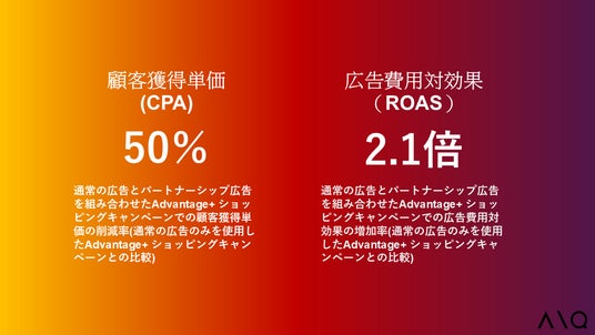 特許技術AIで新たな産業DXを実現するAIQ(アイキュー)株式会社(本社:東京都文京区、代表取締役社長CEO兼COO 渡辺 求、以下 AIQ)が、PAL CLOSETオンラインストアと連携して実施したMeta Advantage+ショッピングキャンペーンが高く評価され、広告費用対効果(ROAS)の大幅な向上と顧客獲得コストの削減を実現した取り組みが、Metaのビジネス向け公式サイトに成功事例として掲載されました。