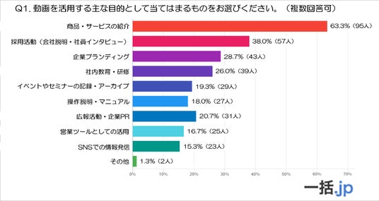 - 最も多かったのは「商品・サービスの紹介」(63.3%)で、全体の6割以上が動画を自社の商品やサービスのPRに活用していることがわかります。
