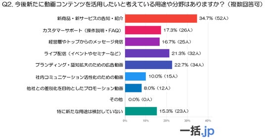 - また、「カスタマーサポート(操作説明・FAQ)」や「経営層やトップからのメッセージ発信」といった、社外・社内の双方に向けた動画活用も一定数挙げられており、コミュニケーション強化や業務効率化を図る目的での活用意向が見られます。