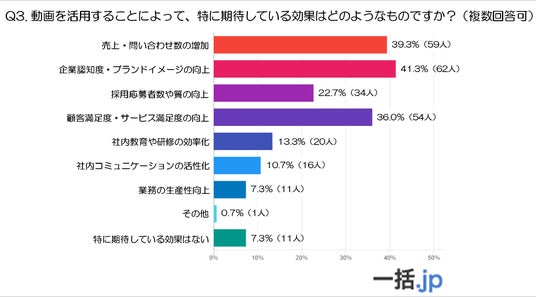 - 続いて「売上・問い合わせ数の増加」(39.3%)や「顧客満足度・サービス満足度の向上」(36.0%)も高い割合となっており、動画活用が直接的なビジネス成果や顧客体験の向上に結びつくことへの期待が大きいことが読み取れます。