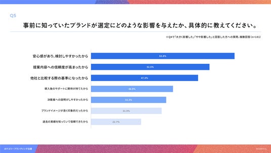 「Q5. Q4で「大きく影響した」「やや影響した」と回答した方にお聞きします。事前に知っていたブランドが選定にどのような影響を与えたか、具体的に教えてください。(複数回答)」(n=141)と質問したところ、「安心感があり、検討しやすかったから」が63.8%、「提案内容への信頼度が高まったから」が52.5%、「他社と比較する際の基準になったから」が47.5%という回答となりました。