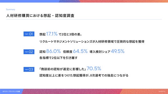 - 01|想起17.1%で、2位と3倍の差。リクルートマネジメントソリューションズが人材研修領域で圧倒的な想起を獲得。