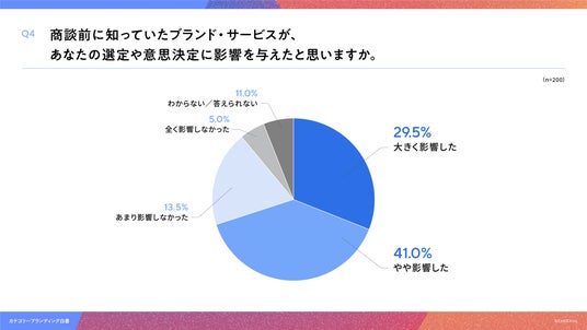 「Q4. 商談前に知っていたブランド・サービスが、あなたの選定や意思決定に影響を与えたと思いますか。」(n=200)と質問したところ、「大きく影響した」が29.5%、「やや影響した」が41.0%という回答となりました。