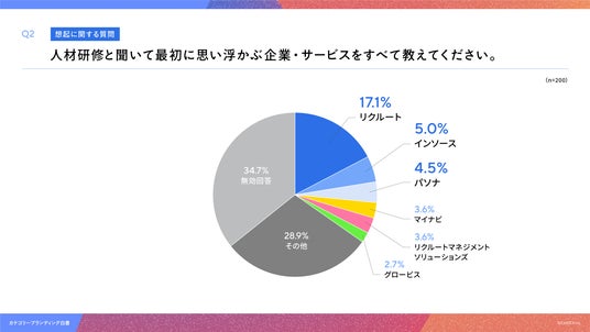 「Q2. 人材研修と聞いて最初に思い浮かぶ企業・サービスをすべて教えてください。(自由回答)」(n=200)と質問したところ、リクルートが17.1%、インソースが5.0%、という回答となりました。