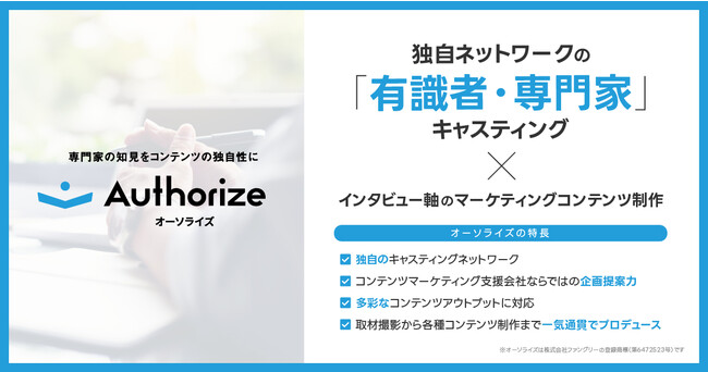 そこでこの度、満を持して有識者・専門家のキャスティング実績や独自ノウハウを生かした、インタビュー軸のマーケティングコンテンツの企画制作サービス「オーソライズ」をリリースすることになりました。