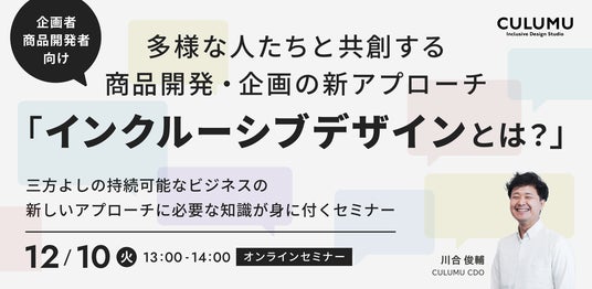 株式会社STYZ(東京都渋谷区、田中辰也 代表取締役社長)は、当社内で運営するインクルーシブデザインスタジオCULUMU主催のオンラインセミナーを12月10日(火)13時から開催します。