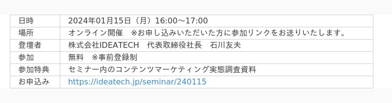 ファクトに基づいたコンテンツ開発とマーケティング支援を行う、株式会社IDEATECH(本社:東京都港区、代表取締役社長:石川友夫、以下 IDEATECH)は、「BtoBのコンテンツマーケティングに関する2023年総括と2024年展望レポート」を発表しましたので、お知らせいたします。