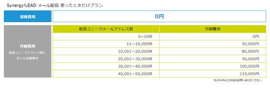 - 配信ユニークアドレス数に応じた従量課金11~10,000件までなら月額50,000円でご利用いただけます。10,001件以上の配信にも対応しています。