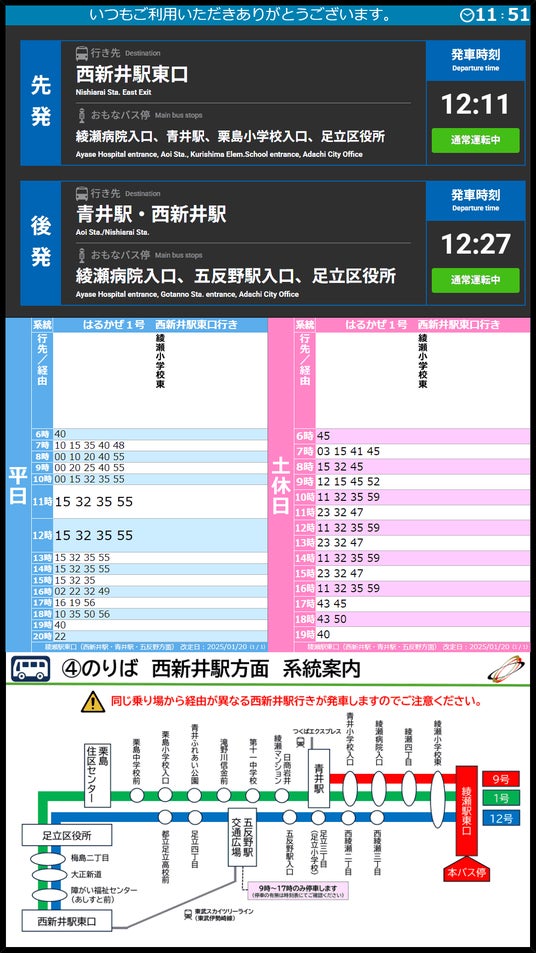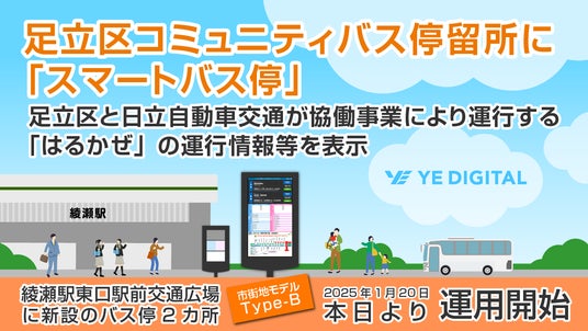 株式会社YE DIGITALが提供する「スマートバス停」は、この度、日立自動車交通株式会社(※1、以下 日立自動車交通)と足立区によって導入され、同区で運行している足立区コミュニティバス「はるかぜ」の綾瀬駅東口駅前交通広場に新設されるバス停のうち2カ所において、2025年1月20日より運用開始いたします。
