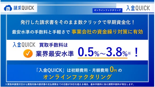 オンラインファクタリング「入金QUICK」について「入金QUICK」は、中小企業の突発的な資金ニーズにスピーディーに対応可能なオンラインファクタリングサービスです。「請求QUICK」で発行した請求書をそのまま数クリックで資金化でき、基本手数料は買取対象とする請求書金額の0.5%~3.8%*1と業界最安水準かつ初期費用や月額固定費用のないシンプルな料金体系で、請求書買取申請から最短2営業日*2でお振込みが可能です。「入金QUICK」は、中小企業の皆さまが抱える資金繰りに関する課題を「安さ・早さ・手軽さ」すべての点において解消し、事業の成長をご支援いたします。