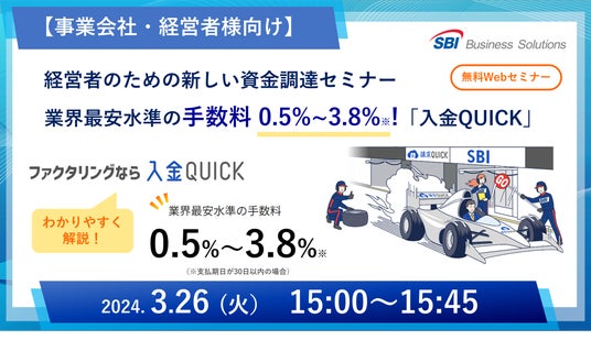 総合フィンテックソリューション企業であるSBI FinTech Solutions株式会社の子会社で、バックオフィス支援サービスを提供するSBIビジネス・ソリューションズ株式会社(本社:東京都港区、代表取締役社長:夏川 雅貴、以下「当社」)は、事業会社・経営者様向けに「業界最安水準の手数料0.5%~3.8%*1!新しいファクタリング 入金QUICKセミナー」を3月26日(火)15時から開催しますので、お知らせいたします。