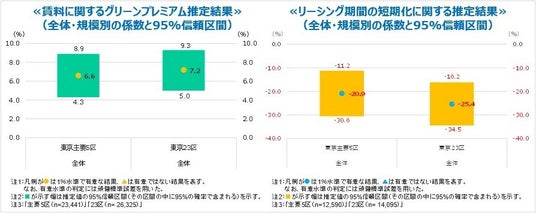 2025年度の分析では、estieが保有するエリア情報・建物情報・時系列の募集情報を基に、環境不動産認証の取得が募集賃料およびリーシング期間に与える影響を検証しました。東京23区のオフィス募集データを対象に、傾向スコア法や操作変数法など複数の推定手法を組み合わせて推定を行い、その結果、東京23区に所在するビルの場合、環境不動産認証を取得したビルでは募集賃料が約7.2%上昇し、リーシング期間は約25.4%短縮する傾向が示されました。