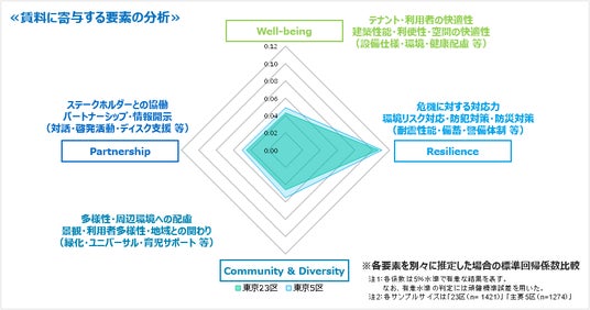 また、テナント企業の環境配慮・ウェルビーイングニーズの高まりを踏まえ、環境性能以外のビル要素にも分析範囲を拡張しました。DBJ Green Building認証※2 におけるWell-being、Resilience、Community & Diversity、Partnershipの各評価項目を個別に推定した結果、レジリエンスやウェルビーイングといった非環境要素についても、賃料に一定の寄与がみられました(なお、本分析では、要素間の多重共線性に対応するため、各要素を個別に推定式へ組み込む形で検証を行っています)。
