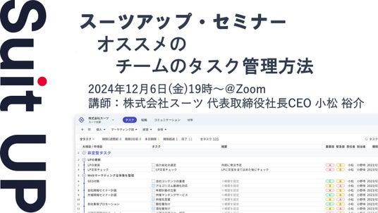 株式会社スーツ(所在地:東京都千代田区、代表取締役社長CEO:小松 裕介)は、2024年12月6日(金)19時から、当社代表の小松が講師を務めるスーツアップ・セミナー「オススメのチームのタスク管理方法」を無料開催します。