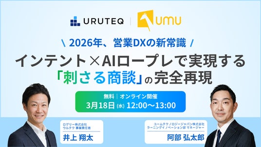 https://uruteq.logly.co.jp/ )』を提供するログリー株式会社(本社:東京都渋谷区、代表取締役:吉永浩和、証券コード:6579、以下、ログリー)と、AIを活用した学習プラットフォームを提供するユームテクノロジージャパン株式会社(本社:東京都新宿区、代表取締役:松田 しゅう平、以下、ユームテクノロジージャパン)は、2026年3月18日(水)に「2026年、営業DXの新常識:インテント×AIロープレで実現する『刺さる商談』の完全再現」をテーマとした無料オンラインウェビナーを共催いたします。