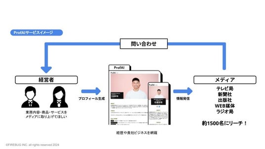 「ProfAI」は、経営者や文化人などプロフェッショナルのためのプロフィール作成サービスです。FIREBUGが有するネットワークのもと、メディアやイベント事業者等が欲している情報に沿ったそれぞれのプロフィールを作成の上、リレーション構築をサポートしています。