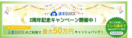 「請求QUICK」は2024年3月1日にサービス提供開始から2周年を迎えました。これを記念して、かんたん・便利なオンラインファクタリング「入金QUICK」と、請求書のクレジットカード決済が可能な「クレカQUICK」のご紹介を兼ねた「請求QUICK 2周年記念キャンペーン」を開催中です。