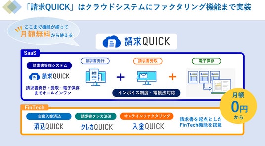 「請求QUICK」は、法制度対応と業務効率化を実現するクラウド型請求書管理システム(SaaS)をベースに3つのFinTech機能が組み込まれており、月額無料からご利用いただくことができます。金融機関とのAPI連携による自動明細取得機能で面倒な入出金の消込作業を大幅に効率化する「消込QUICK」、発行した請求書をクレジットカードでオンライン決済できる「クレカQUICK」、発行した請求書をWeb完結で資金化できるオンラインファクタリング「入金QUICK」という3つのFinTech機能を、すべて1つのシステムで提供しています。