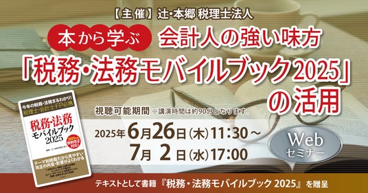 辻・本郷 税理士法人(本社:東京都新宿区、理事長:桑木小恵子)は、2025年6月26日(木)より「本から学ぶ 会計人の強い味方「税務・法務モバイルブック2025」の活用」Webセミナーを開催いたします。