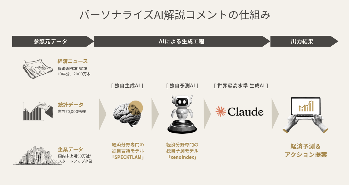 『xenoBrain』は、経済ニュースや企業開示資料、統計データなど、膨大な情報を独自のAIで解析し、企業業績や素材価格、業界需要など様々な経済情報を予測するプラットフォームです。
