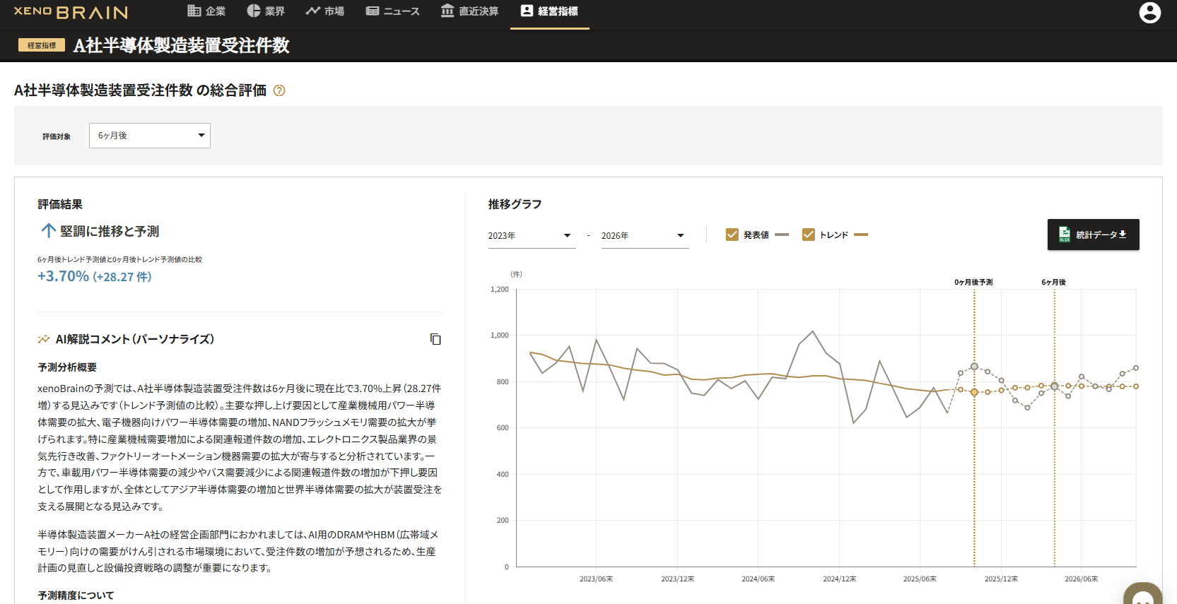 独自AIによる高精度な経営指標予測xenoBrain独自の予測AIが算出した経営指標予測およびその根拠分析をもとに、1年先までの上昇・下降トレンドと主要な変動要因を要約・解説します。また、過去実績や外部統計データとの比較分析により、乖離要因や前提条件を整理し、予測の信頼性と活用方針を明確化します。