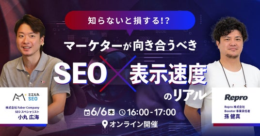 本セミナーでは、サイトの表示速度改善に取り組むRepro 孫氏とSEOスペシャリストであるFaber Company 小丸が「SEO×表示速度」への見解を語ります。