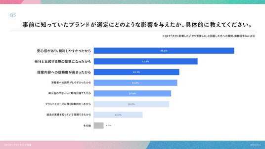 「Q5. Q4で「大きく影響した」「やや影響した」と回答した方にお聞きします。事前に知っていたブランドが選定にどのような影響を与えたか、具体的に教えてください。(複数回答)」(n=149)と質問したところ、「安心感があり、検討しやすかったから」が69.1%、「他社と比較する際の基準になったから」が51.0%、「提案内容への信頼度が高まったから」が42.3%という回答となりました。