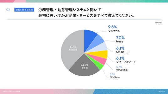 「Q2. 労務管理・勤怠管理システムと聞いて最初に思い浮かぶ企業・サービスをすべて教えてください。(自由回答)」(n=200)と質問したところ、「ジョブカン」が9.6%、「freee」が7.0%という回答となりました。