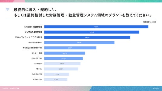 「Q7. 最終的に導入・契約した、もしくは最終検討した労務管理・勤怠管理システム領域のブランドを教えてください。(複数回答)」(n=200)と質問したところ、「SmartHR労務管理」が46.5%、「ジョブカン勤怠管理」が42.0%、「マネーフォワード クラウド勤怠」が38.5%という回答となりました。