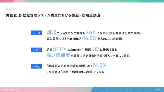 BtoB購買において、顧客は営業担当者と接触するはるか手前で、すでに候補企業を絞り込んでいます。本調査の第9弾となる労務管理・勤怠管理システム領域では、「商談前に知っていたブランドが意思決定に影響した」と回答した割合が74.5%に達し、事前認知の重要性が改めて浮き彫りとなりました。本調査シリーズでは、全16カテゴリー(経費精算システム、タレントマネジメント、電子契約、MAツール等)における認知度・想起順位の実態を順次発表してまいります。