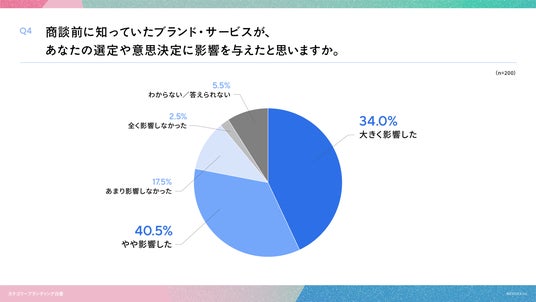 「Q4. 商談前に知っていたブランド・サービスが、あなたの選定や意思決定に影響を与えたと思いますか。」(n=200)と質問したところ、「大きく影響した」が34.0%、「やや影響した」が40.5%という回答となりました。