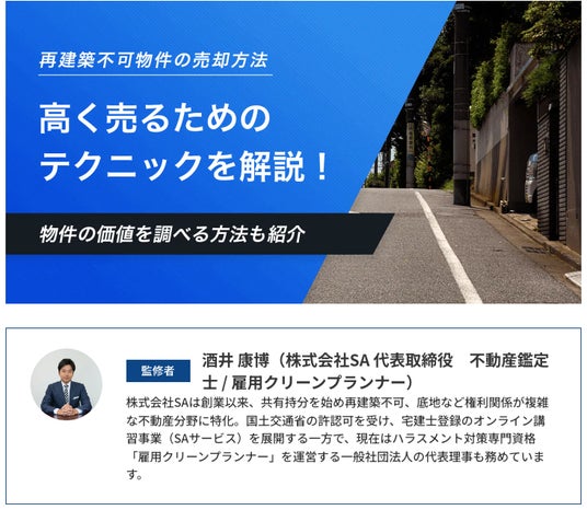 株式会社SA(代表取締役:酒井 康博、本社:東京都千代田区紀尾井町3-12 紀尾井町ビル6階 )は、不動産売買の悩みをすべて解決できる専門サイト「イエコン」(運営会社:株式会社クランピーリアルエステート 代表取締役 大江 剛、寺田 真吾)における再建築不可の売却記事を監修しました。