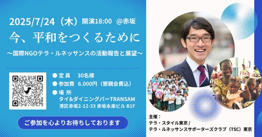 認定NPO法人テラ・ルネッサンス(理事長:吉田真衣、所在地:京都府京都市、以下テラ・ルネッサンス)は、創設者・鬼丸昌也による活動報告会「今、平和をつくるために ~国際NGOテラ・ルネッサンスの活動報告と展望~」を、2025年7月24日(木)に東京・赤坂にて開催いたします。