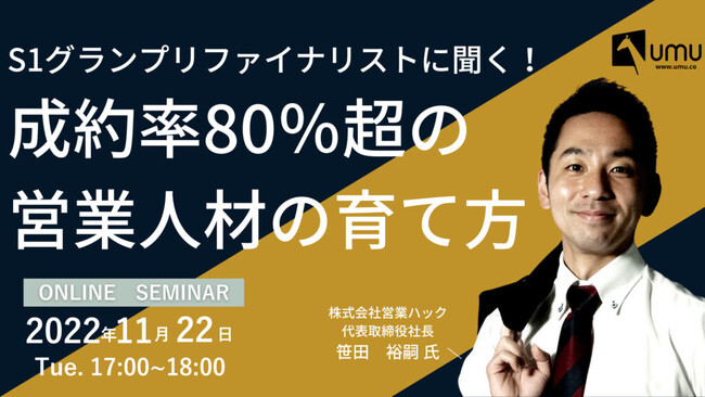 『S1グランプリファイナリスト営業ハック笹田が語る!成約率80%超の営業人材の育て方|11/22(火)17:00~|200名以上の営業人材支援を行ってきた営業ハック笹田×企業研修の効果最大化を支援するUMUのコラボウェビナー開催!』