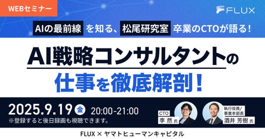 ヤマトヒューマンキャピタル株式会社(本社:東京都千代田区、代表取締役:堀江 大介)は、2025年9月19日(金) 20:00よりオンラインにて、株式会社FLUX CTO 李 然 氏、執行役員/事業本部長 酒井 芳樹 氏にご登壇いただくウェビナー『AIの最前線を知る、松尾研究室卒業のCTOが語る!AI戦略コンサルタントの仕事を徹底解剖!』を開催いたします。