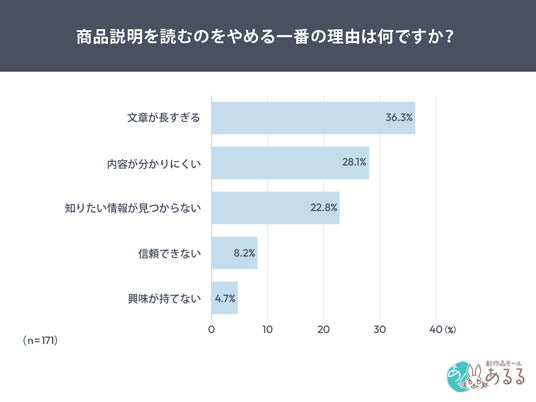 商品説明を読むのをやめる理由については、「文章が長すぎる」が36.3%で最多となりました。