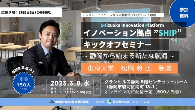キックオフセミナーは、2023年3月(予定)に、静岡市内に開所するイノベーション拠点「SHIP」の開所記念イベントとなっております。当日は、AIやデジタル分野の先駆者の講演を軸に、ICTを活用したビジネスの創造や変革について考える時間となっております。