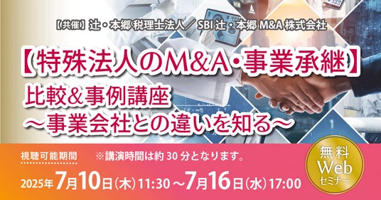 辻・本郷 税理士法人(本社:東京都新宿区、理事長:桑木小恵子)は、SBI 辻・本郷M&A 株式会社(本社:東京都千代田区、代表取締役:小林堅悟)と共催で、2025年7月10日(木)より「【特殊法人のM&A・事業承継】比較&事例講座~事業会社との違いを知る~」セミナーを開催いたします。