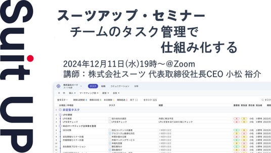 株式会社スーツ(所在地:東京都千代田区、代表取締役社長CEO:小松 裕介)は、2024年12月11日(水)19時から、当社代表の小松が講師を務めるスーツアップ・セミナー「チームのタスク管理で仕組み化する」を無料開催します。