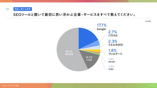 「Q2. SEOツールと聞いて最初に思い浮かぶ企業・サービスをすべて教えてください。(自由回答)」(n=200)と質問したところ、Googleが17.7%、パスカルが2.7%、ミエルカSEO(Faber Company)が2.3%という回答となりました。