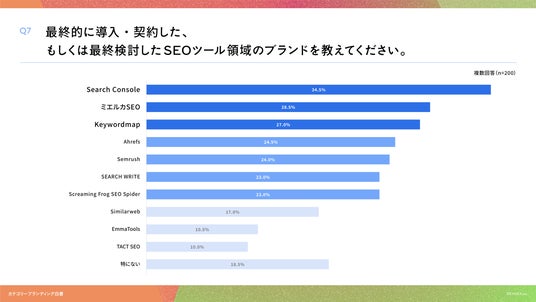 「Q7. 最終的に導入・契約した、もしくは最終検討したSEOツール領域のブランドを教えてください。(複数回答)」(n=200)と質問したところ、 Search Console が34.5%、ミエルカSEO が28.5%、Keywordmap が27.0%という回答となりました。