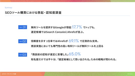 - 01|無料ツールを提供するGoogleが想起17.7%でトップも、選定候補ではSearch ConsoleにAhrefsが並ぶ。