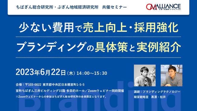 ブランディングテクノロジー株式会社(代表取締役社長:木村 裕紀、本社:東京都渋谷区、証券コード7067、以下当社)は、株式会社ちばぎん総合研究所(本社:千葉県千葉市、代表取締役社長:前田 栄治、以下ちばぎん総合研究所)が主催する「ブランディングの具体策と実例紹介」セミナーに登壇することが決まりました。2023年6月22日(木)に東京会場とZoomウェビナーで同時開催致します。