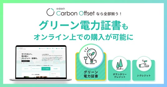 「e-dash Carbon Offset」は、信頼性の高いJ-クレジットや世界中のボランタリー・クレジットを、自社の状況やニーズに合わせて、少量からでも購入ができるオンラインマーケットプレイスです。この度、グリーン電力証書の販売も開始しました。
