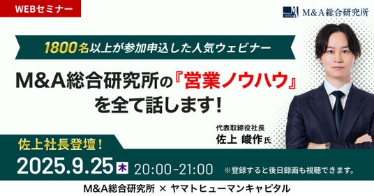 ヤマトヒューマンキャピタル株式会社(本社:東京都千代田区、代表取締役:堀江 大介)は、2025年9月25日(木) 20:00より、株式会社M&A総合研究所 代表取締役社長 佐上 峻作 氏にご登壇いただくウェビナー『M&A総合研究所の営業ノウハウを全て話します!』を開催いたします。