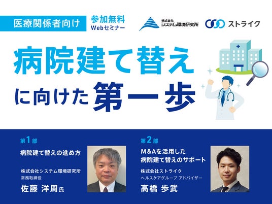 株式会社ストライク(東京都千代田区、代表取締役社長:荒井邦彦)は2024年12月19日(木)、21日(土)、22日(日)に、医療機関の建て替えや経営に長年携わってきた株式会社システム環境研究所と共にライブ配信セミナー『病院建て替えに向けた第一歩』を開催いたします。